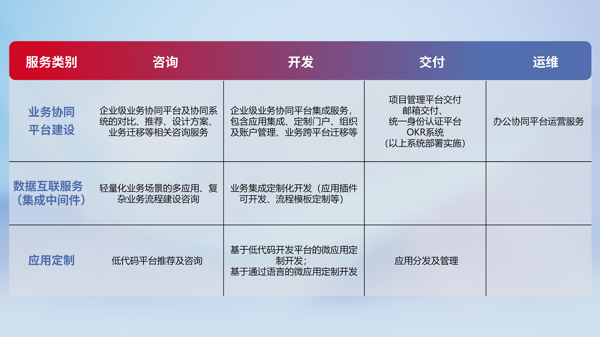 针对钉钉、、企微、、、、IDaas等平台级产品提供产品的规划、、、方案、、交付、、、、定制化开发等服务,,,,实现如统一协同办公、、、智能客户服务、、、、混合会议管理、、、智能数据查询、、、等业务场景,,实现数字化转型。。