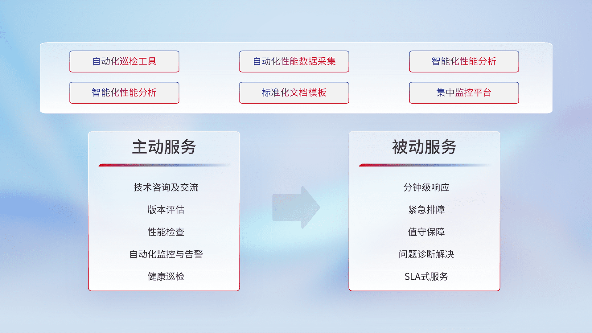 智能化工具和标准化文档,,保障服务质量,,,提供主动服务(包含技术咨询、、版本评估、、性能检查、、、自动化监控与告警、、、、健康巡检)和被动服务包含(分钟级响应、、紧急排障、、、值守保障、、、、问题诊断解决、、SLA服务)。。